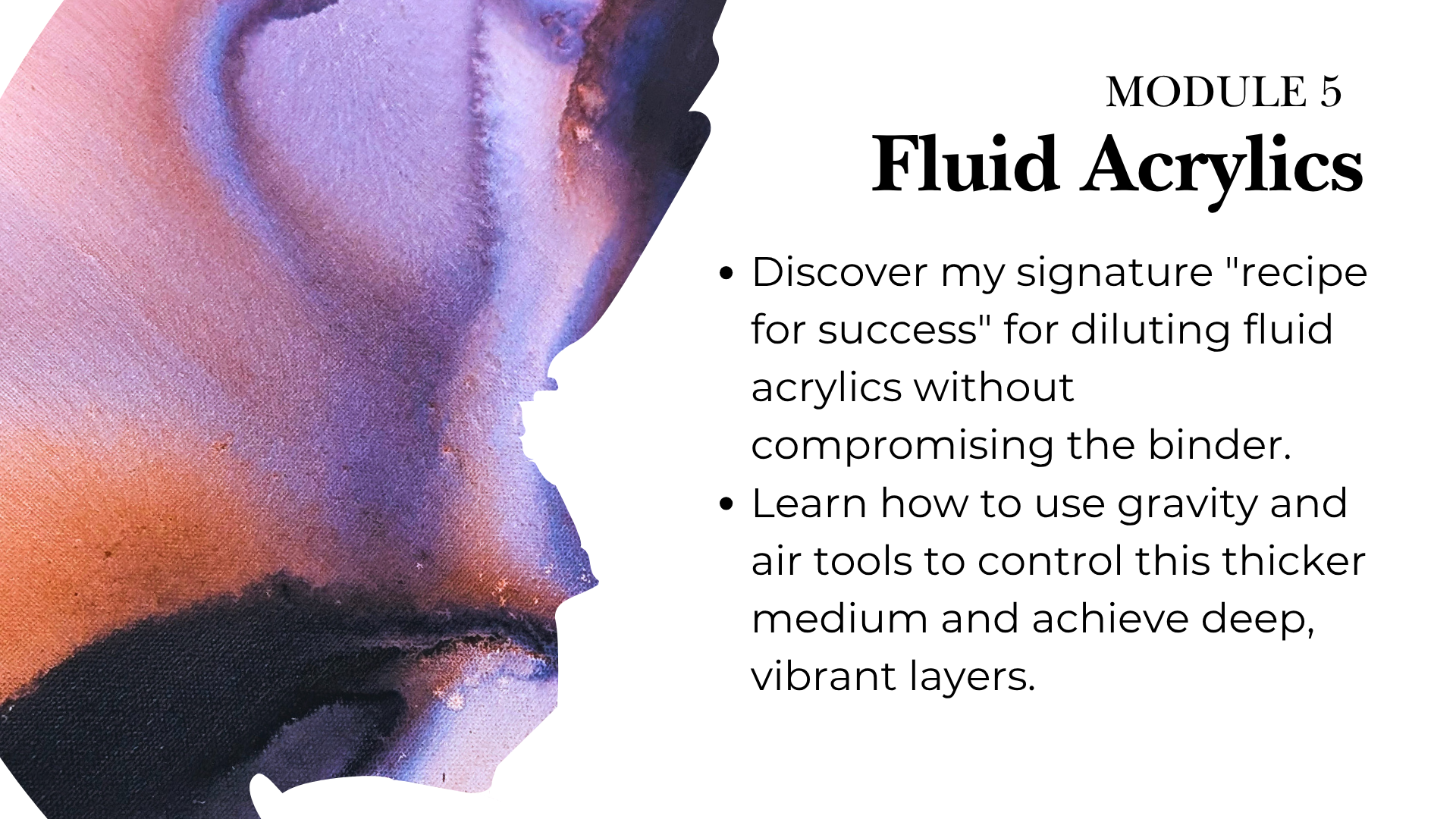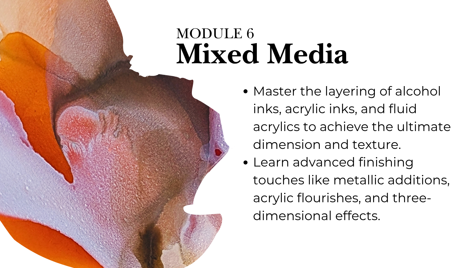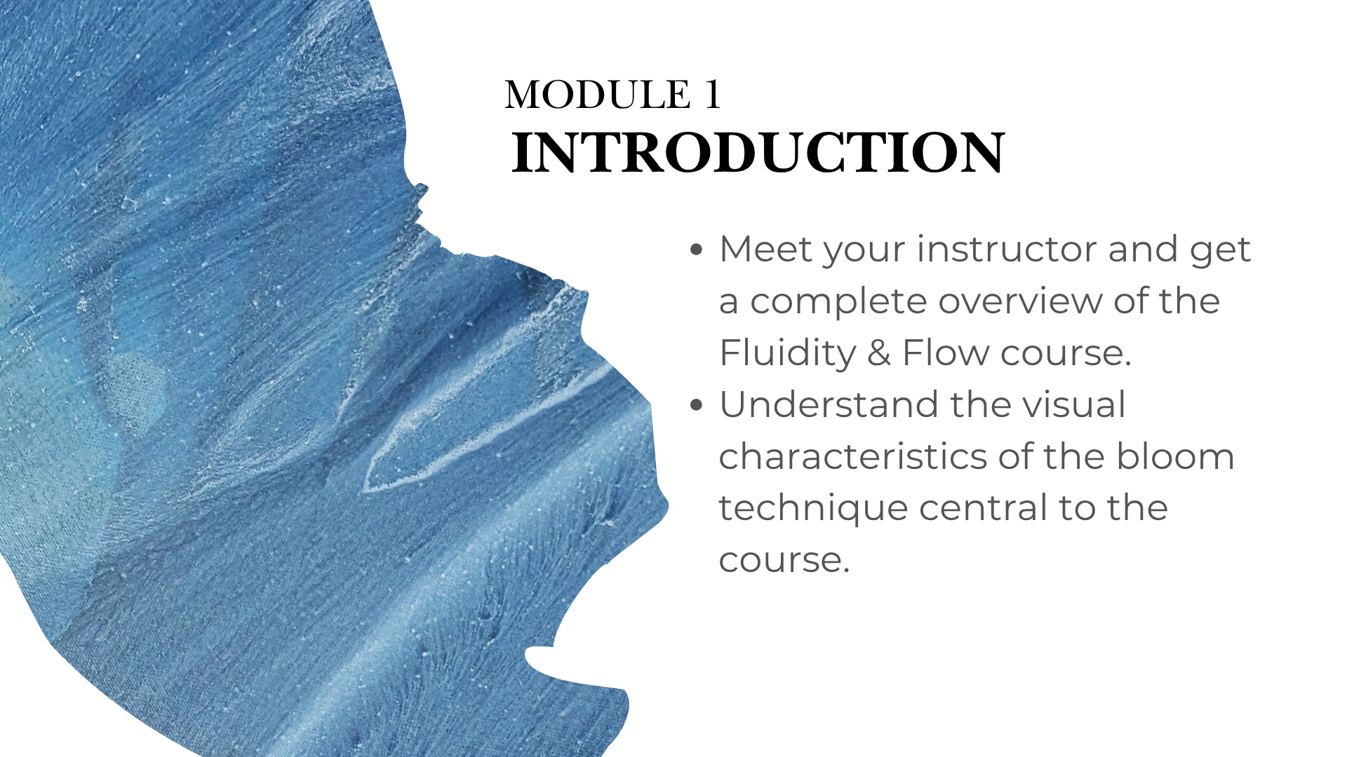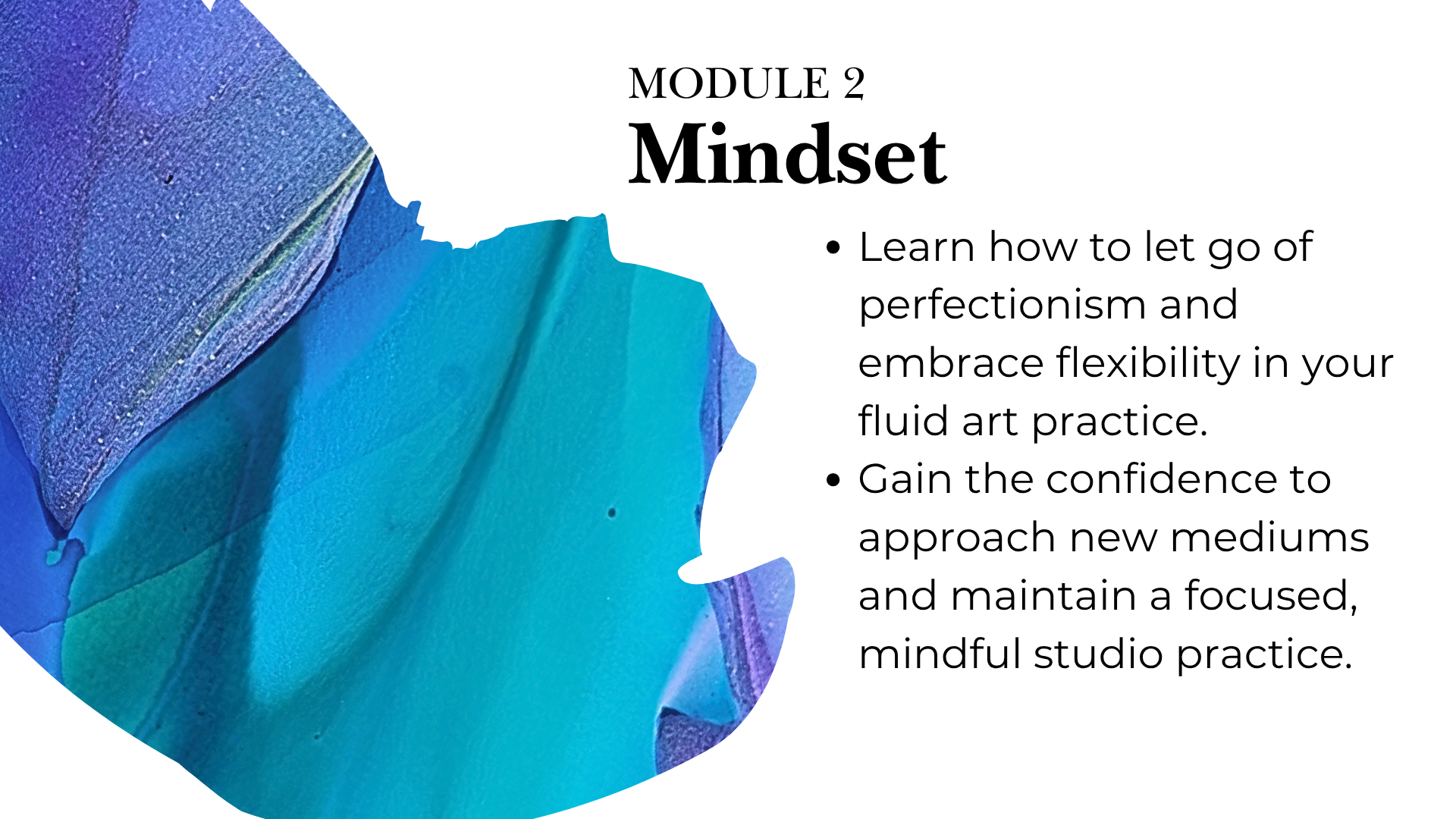 The Fluidity & Flow course is designed for complete mastery, featuring 7 modules and over 8+ hours of instruction. With more than 65+ video lessons, you can pause, replay, and review every technique until it's perfected. I've designed the curriculum to progress logically from foundational mindset to advanced mixed media, ensuring you build skills step-by-step. While the course is suitable for all ages (teens, adults, and even supervised children), following the module order is highly recommended for the best results.